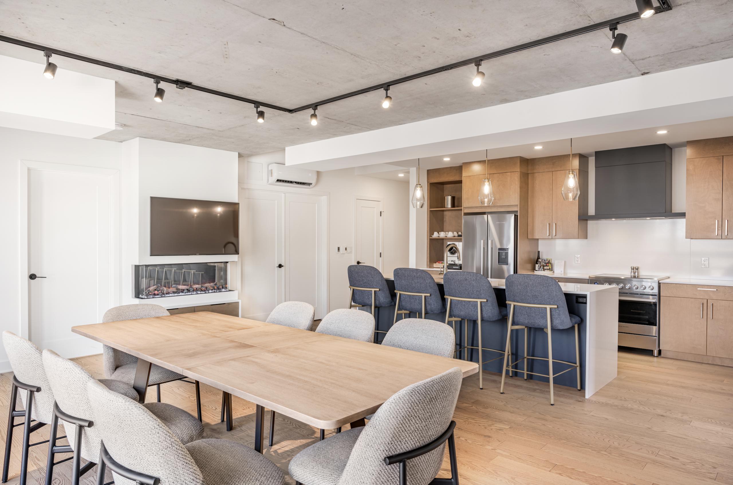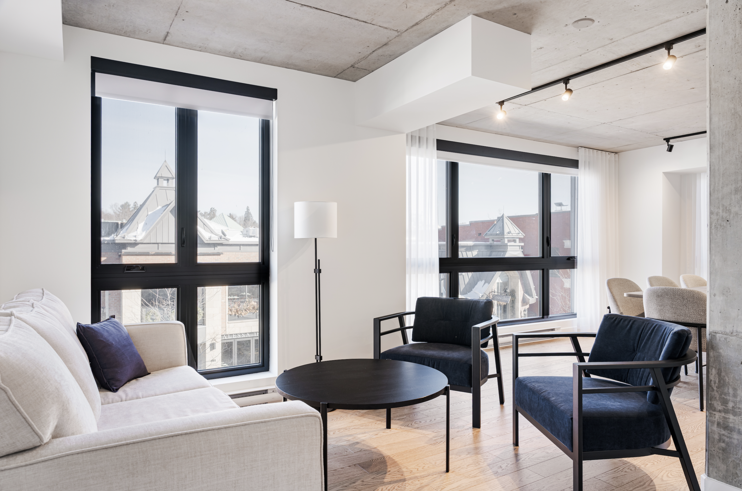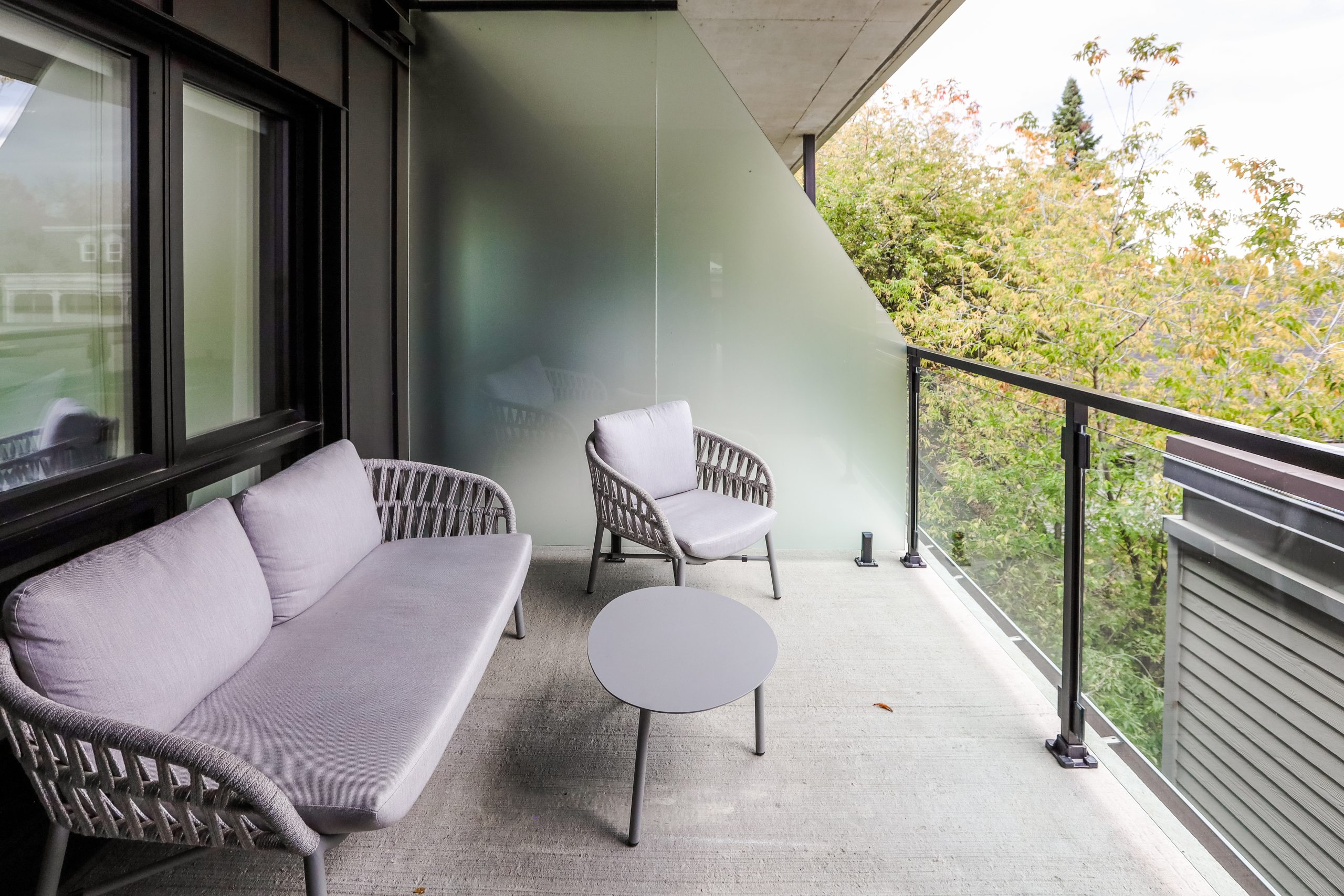 Its heated balcony reveals a panoramic view of Main Street, blending elegance with vibrant city life.