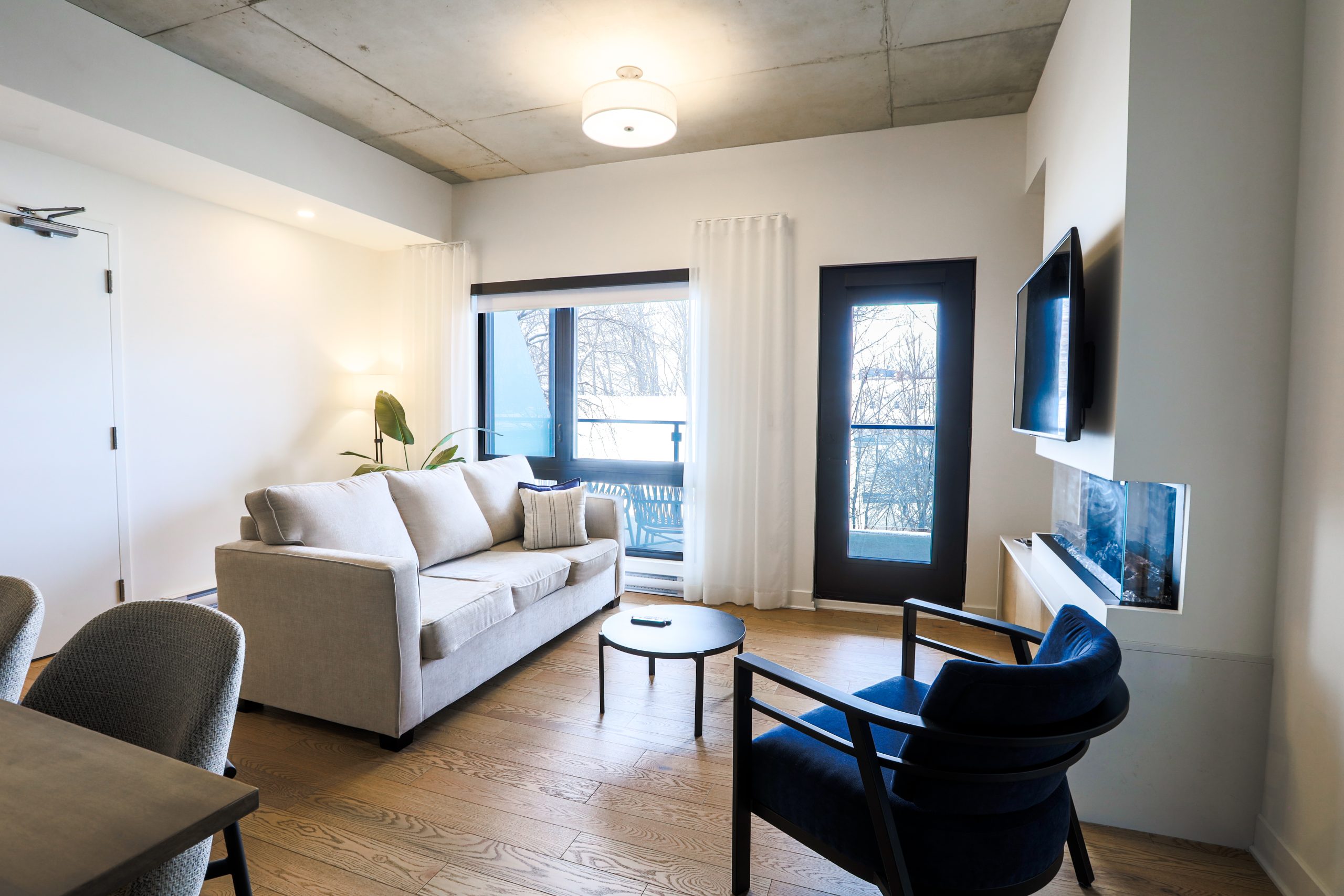 A one-bedroom suite featuring a fully equipped kitchen, washer and dryer, a queen bed and a private balcony.