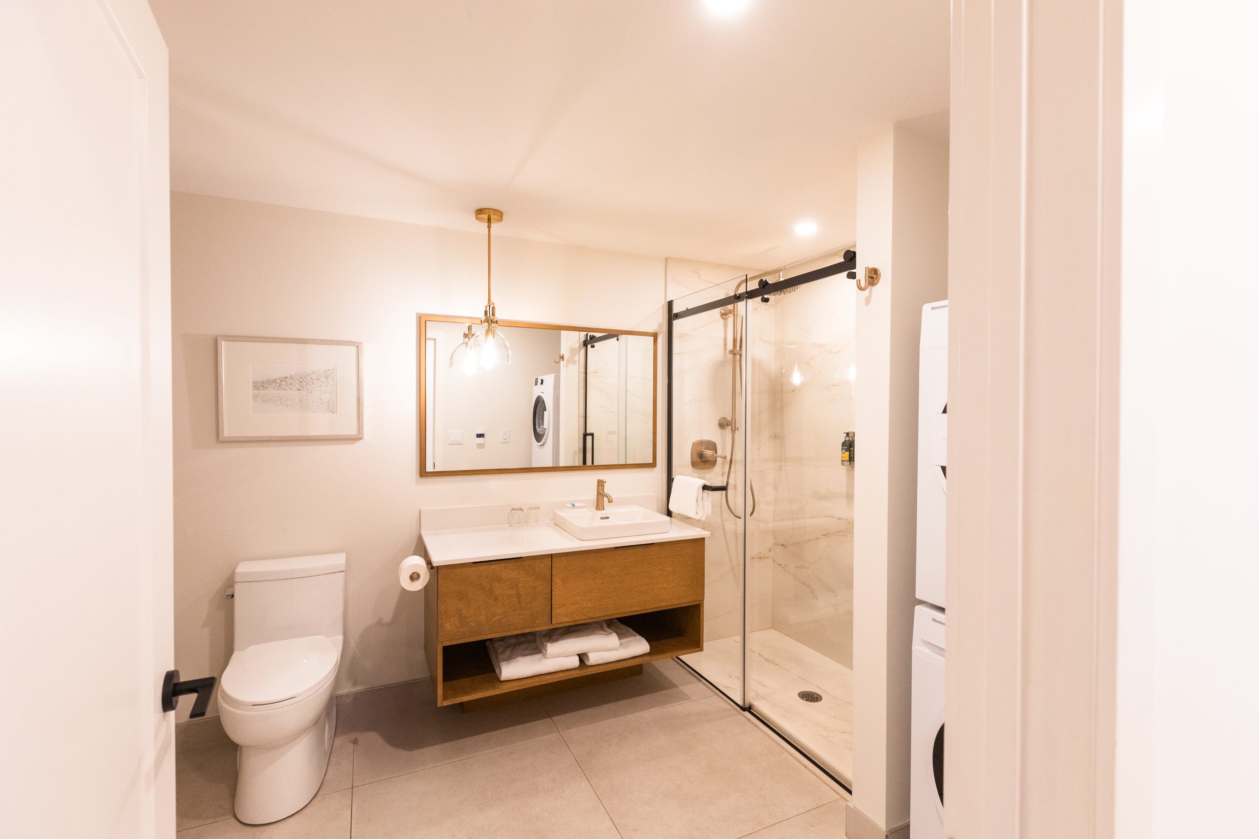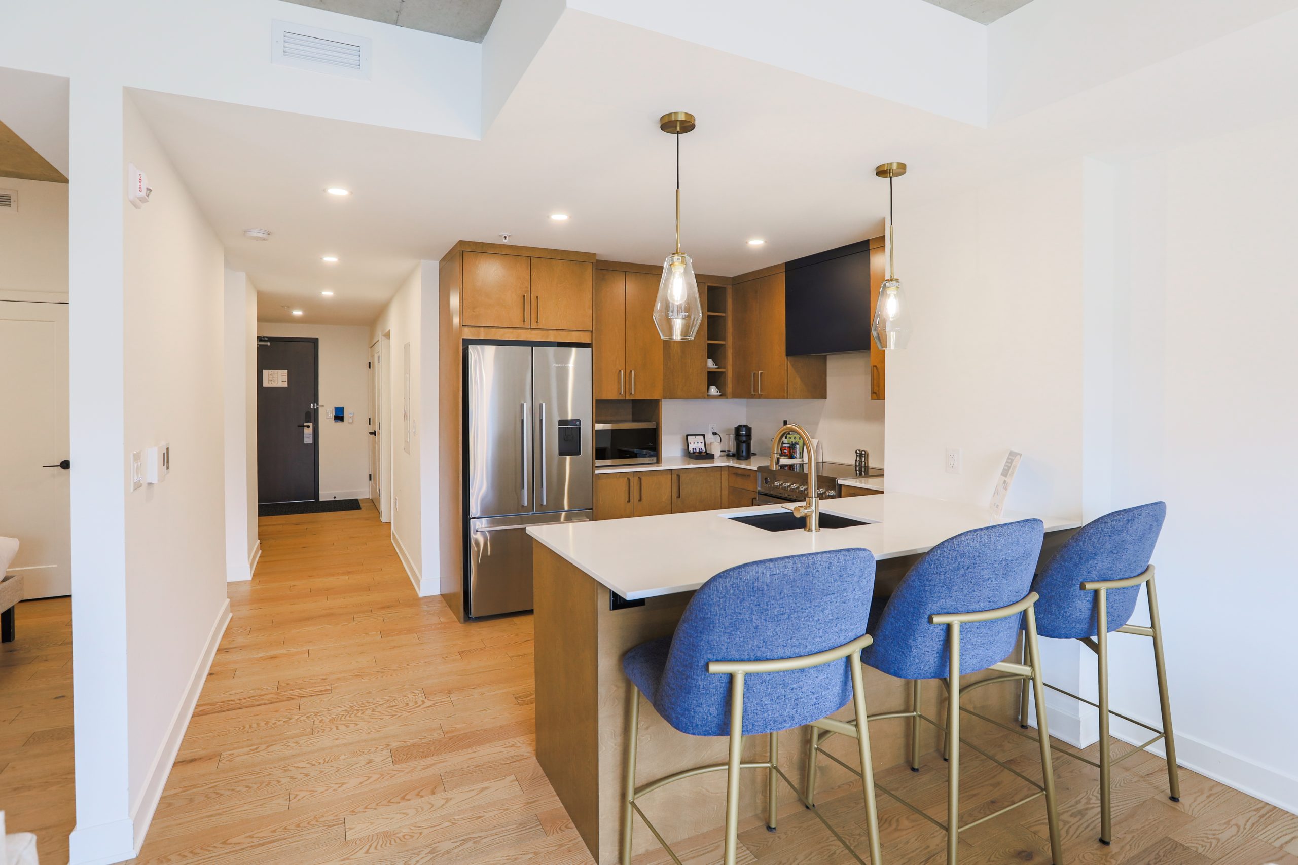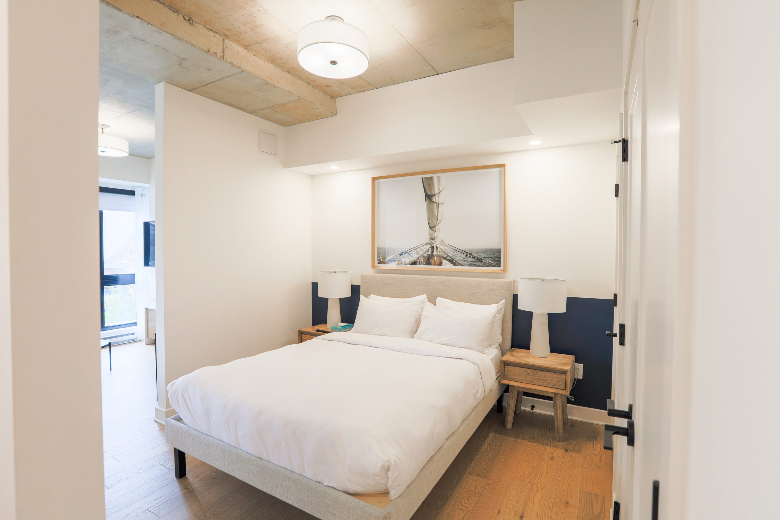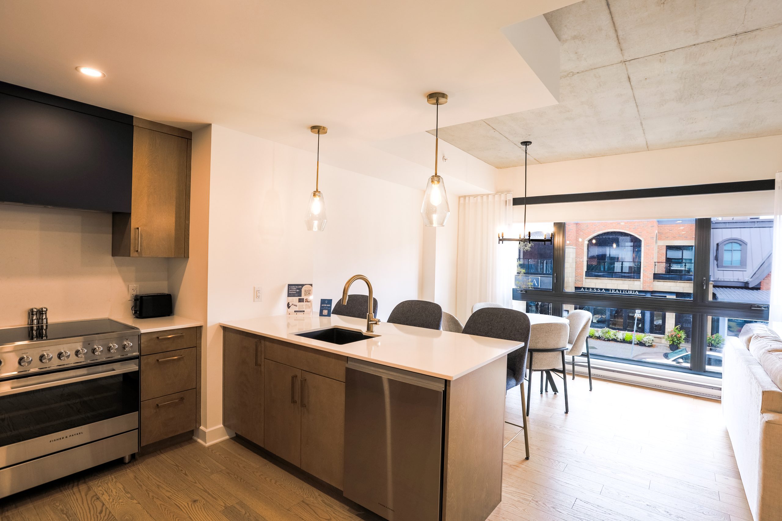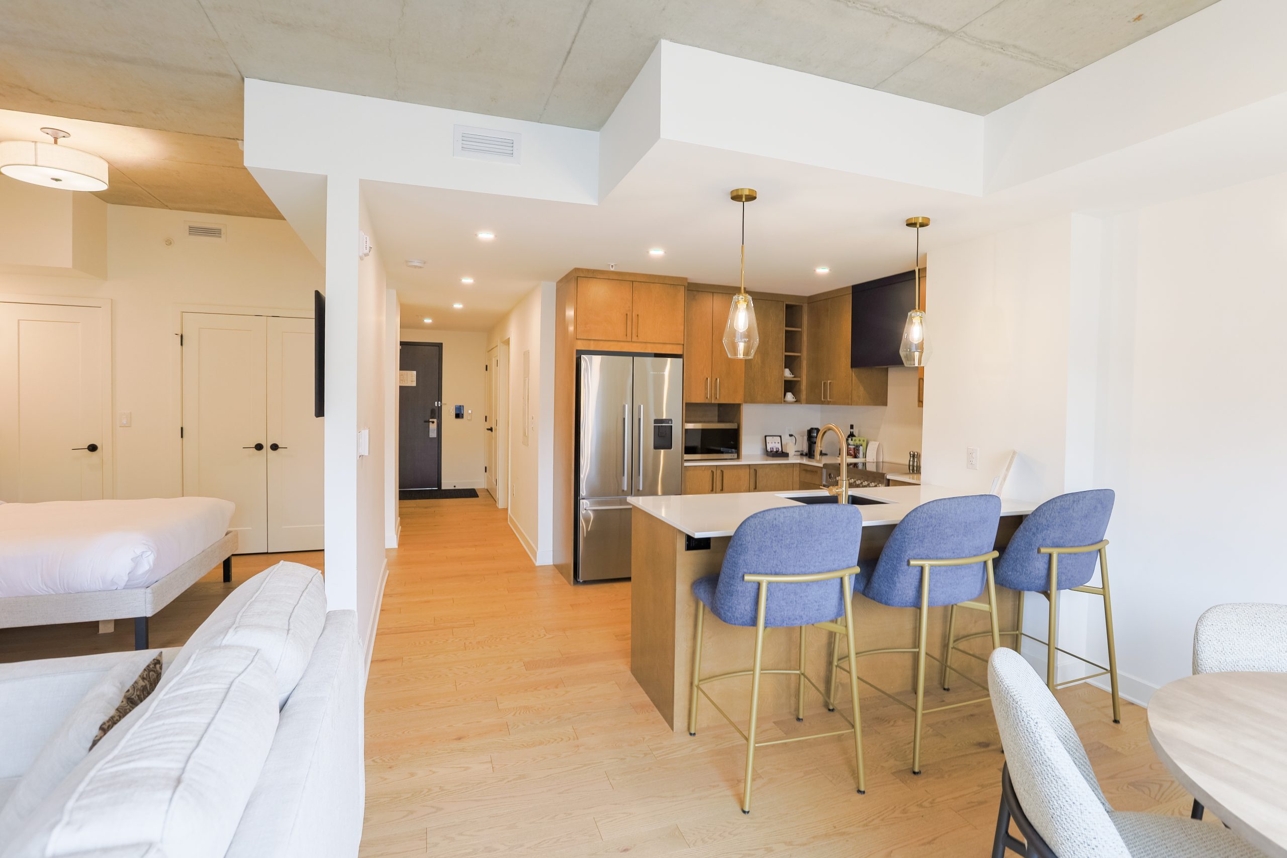 Un studio de luxe au design moderne offrant un espace de vie lumineux, une cuisine entièrement équipée, un grand lit et une vue élégante sur la ville.