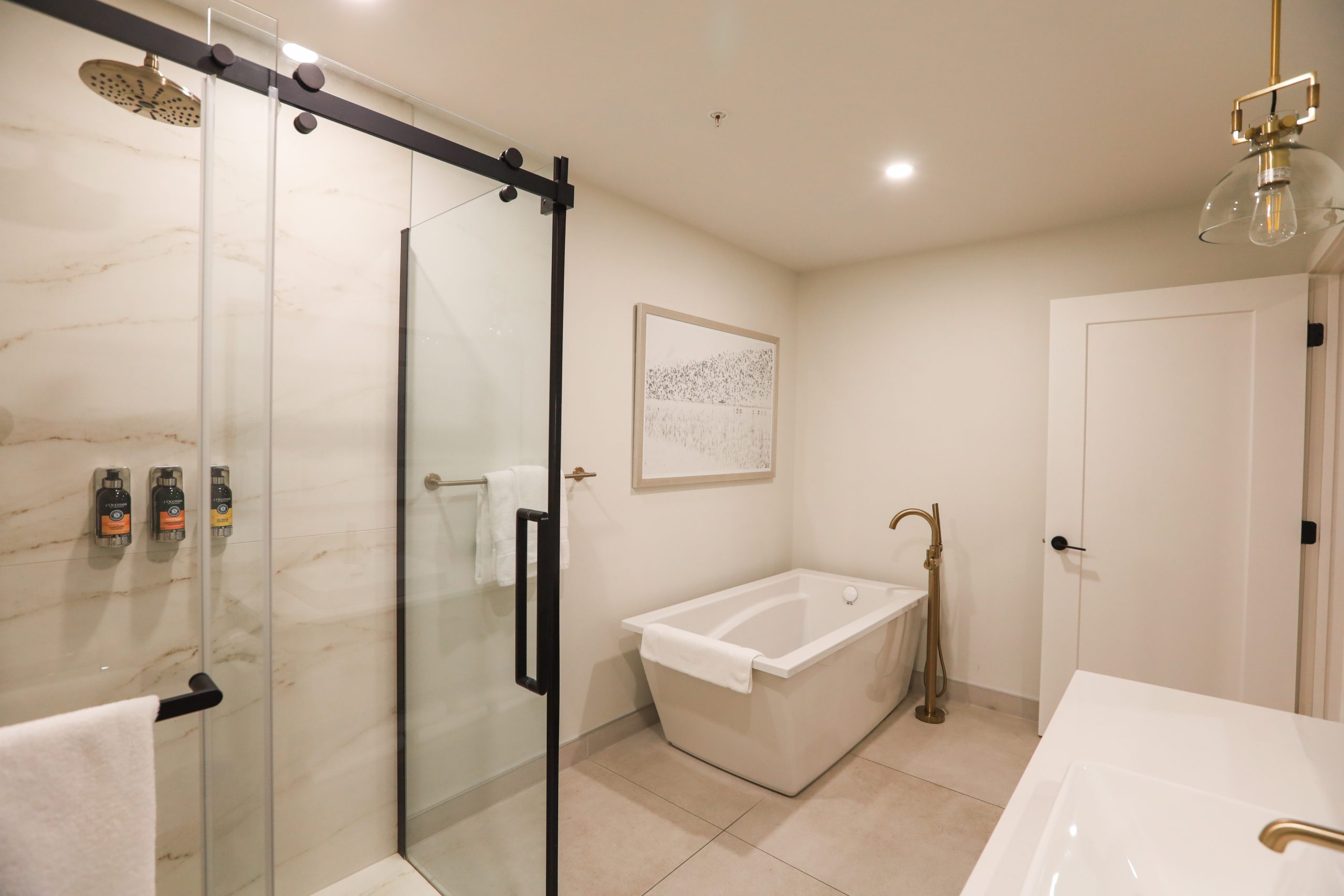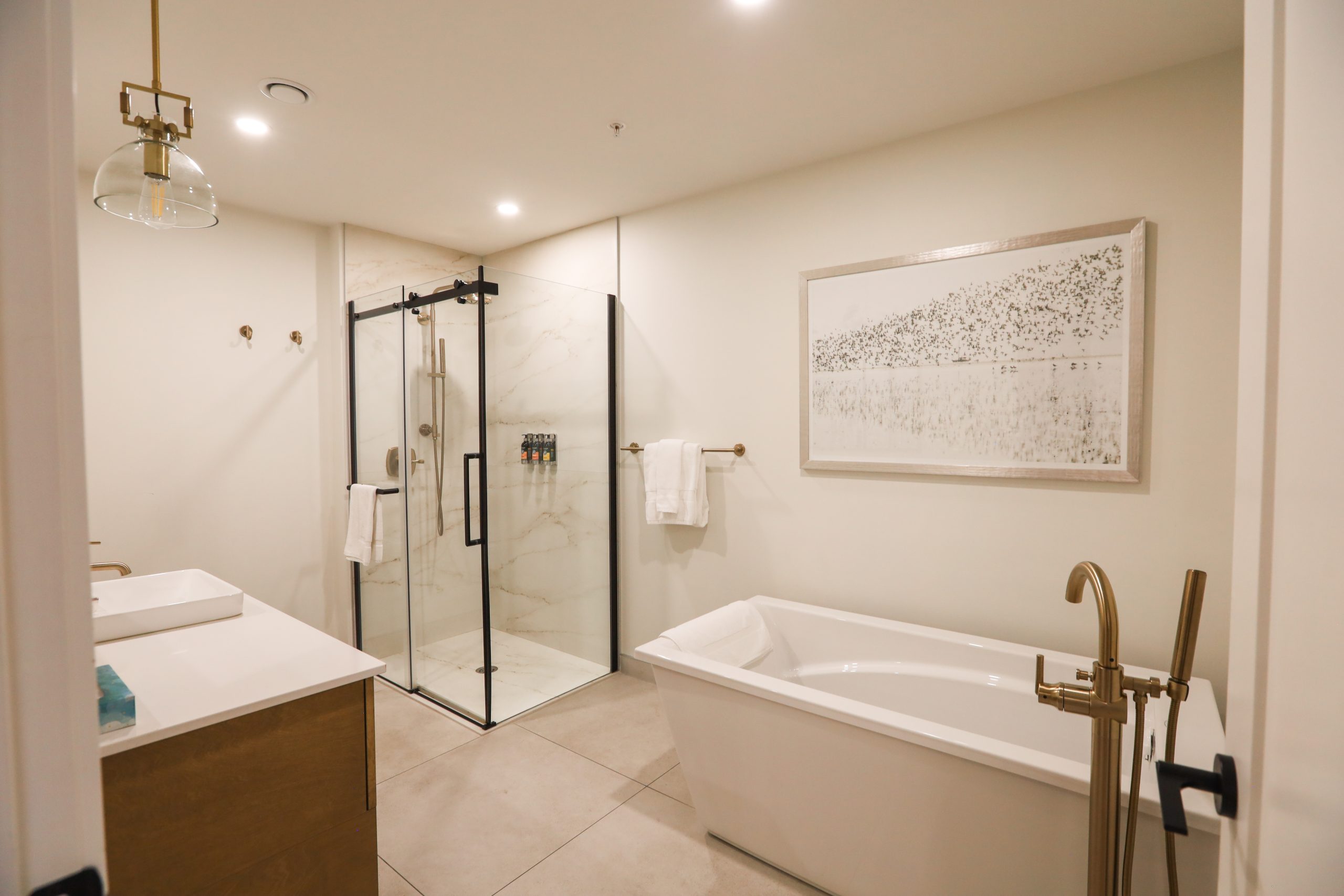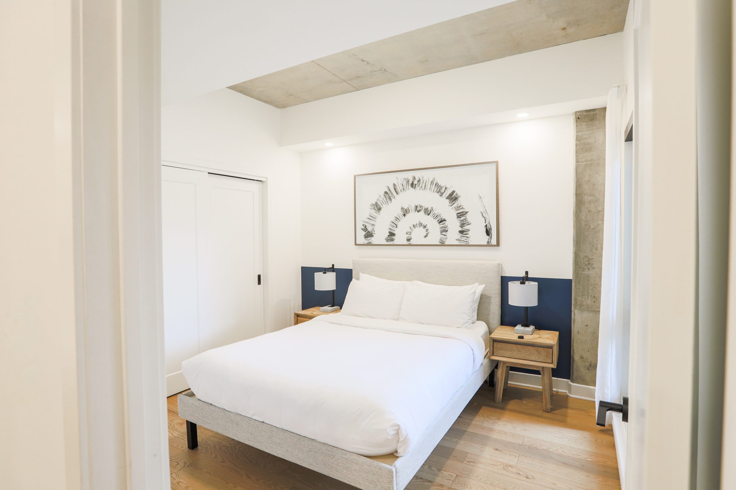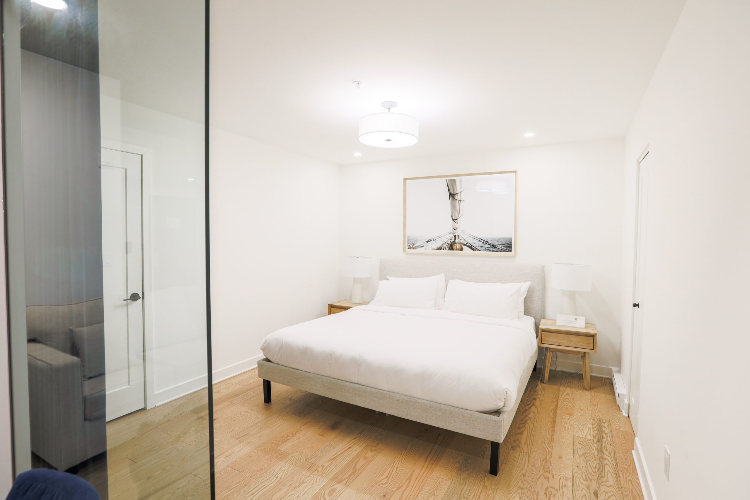 Une suite de deux chambres offrant une cuisine complète, une laveuse et sécheuse, un grand lit, un très grand lit et un balcon privé.