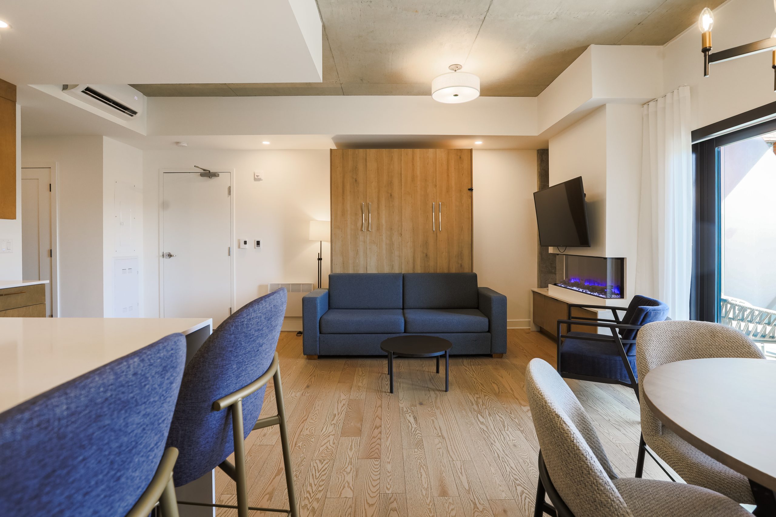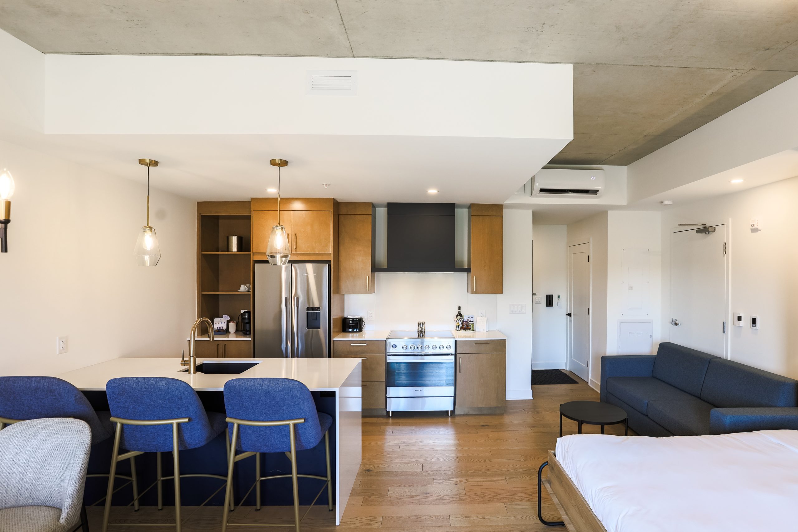 Un studio lumineux et fonctionnel offrant un grand lit escamotable, une cuisine entièrement équipée et un balcon privé pour savourer l’air frais des Cantons-de-l’Est.