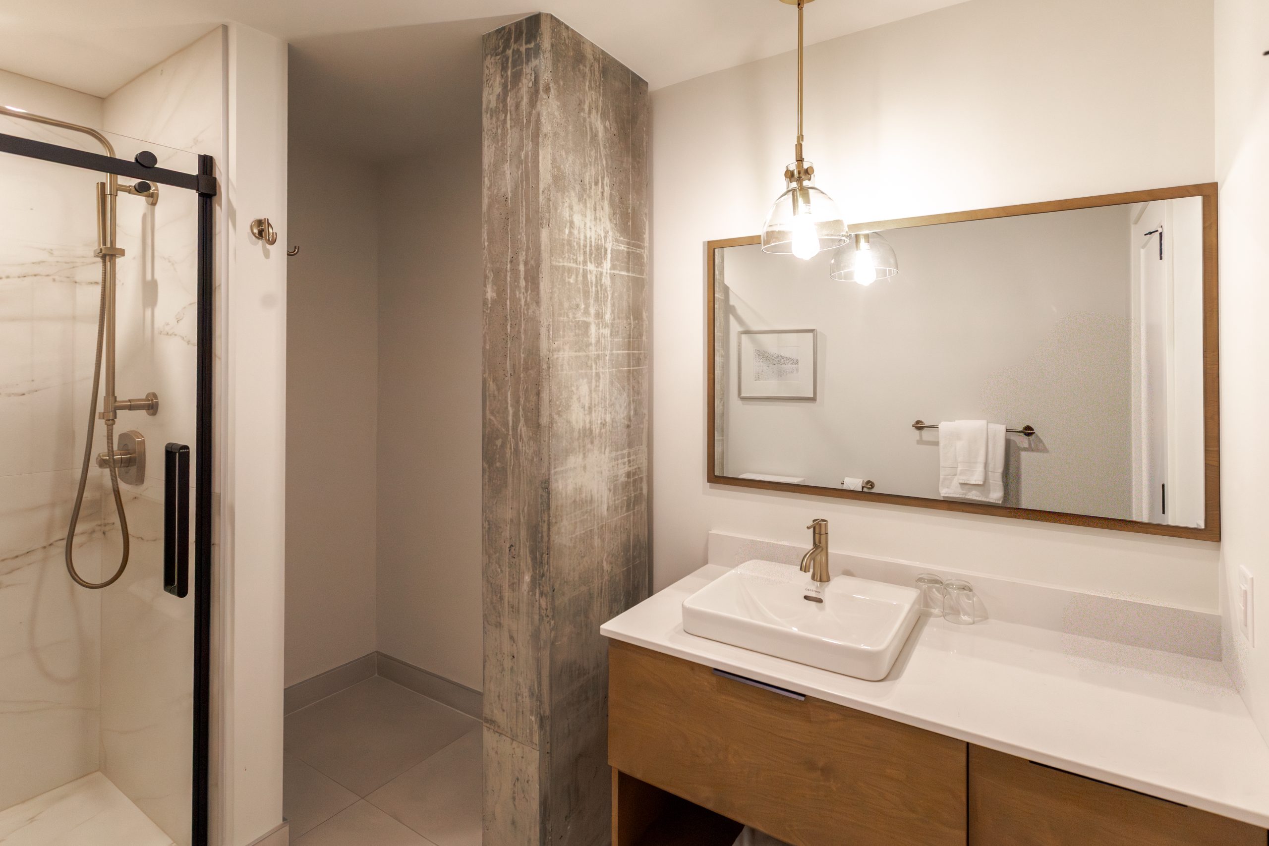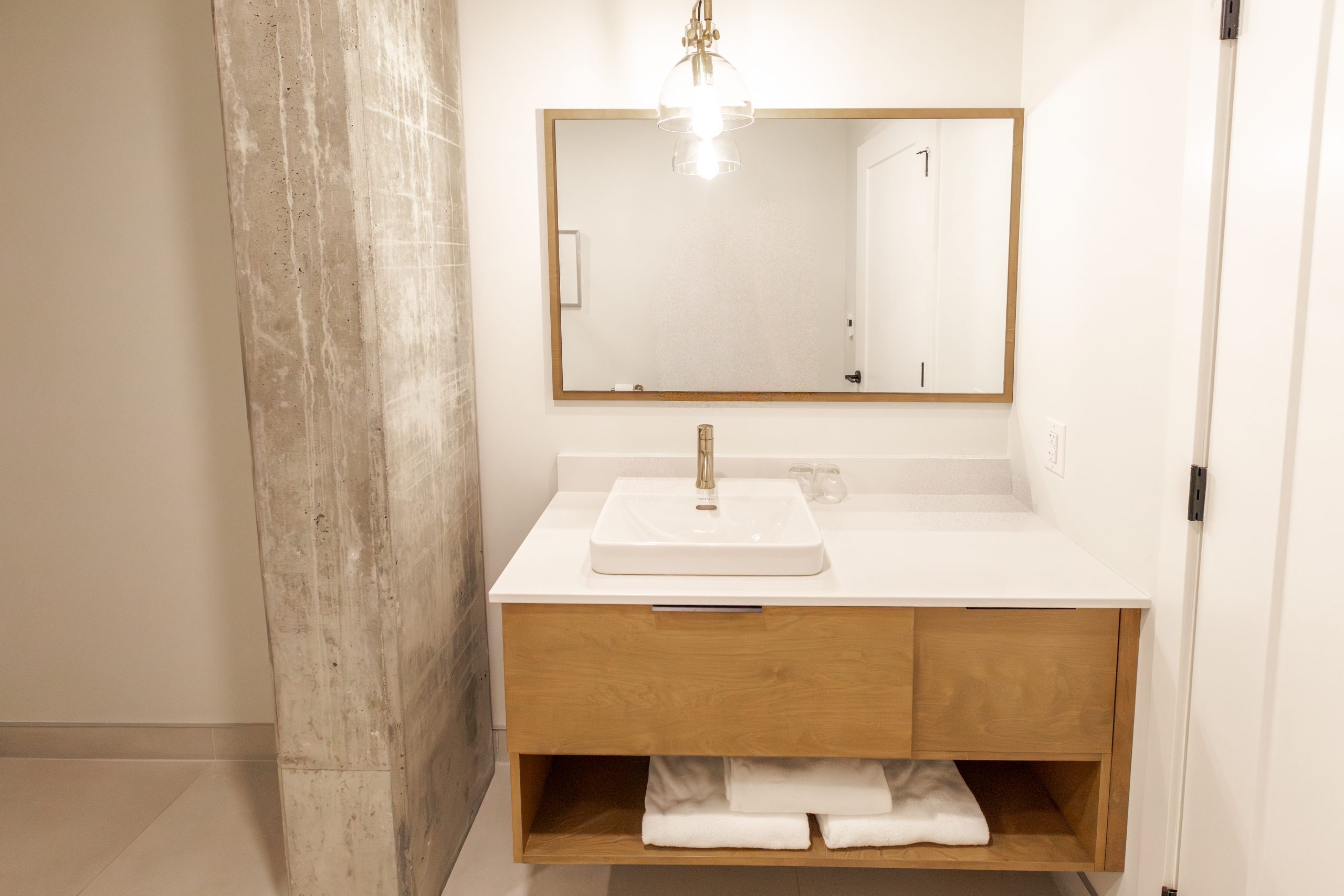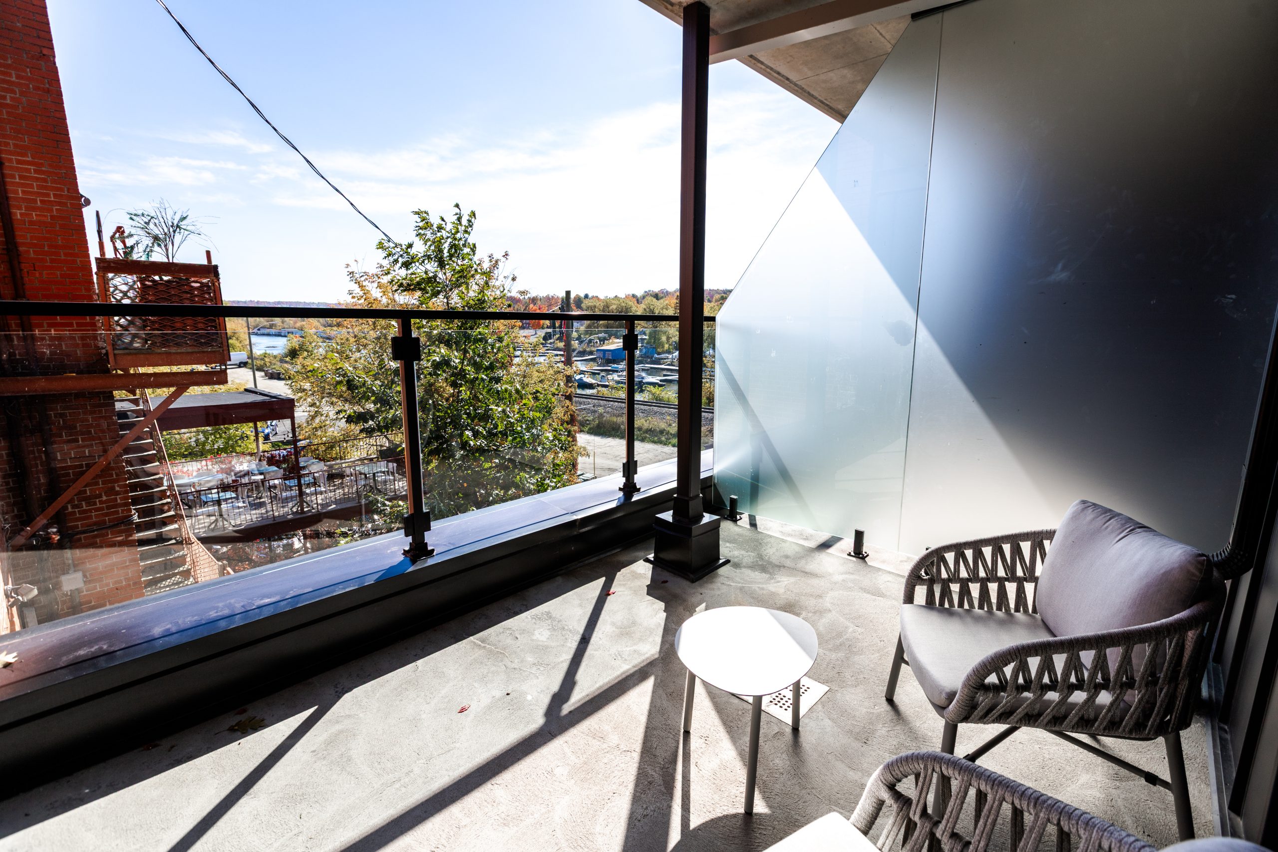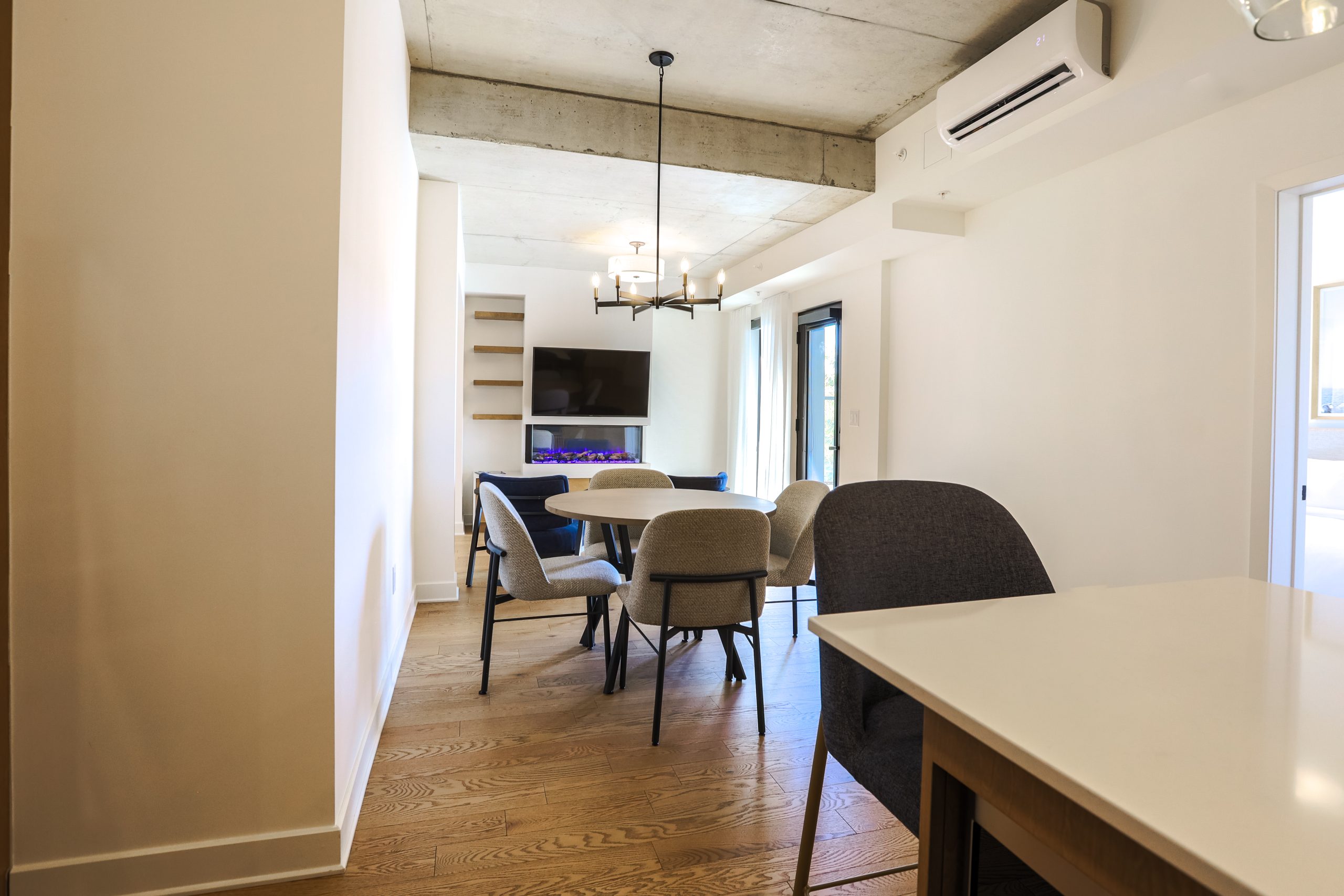 Une suite élégante offrant une chambre fermée, une cuisine complète, une laveuse et sécheuse, un très grand lit et un balcon privé.
