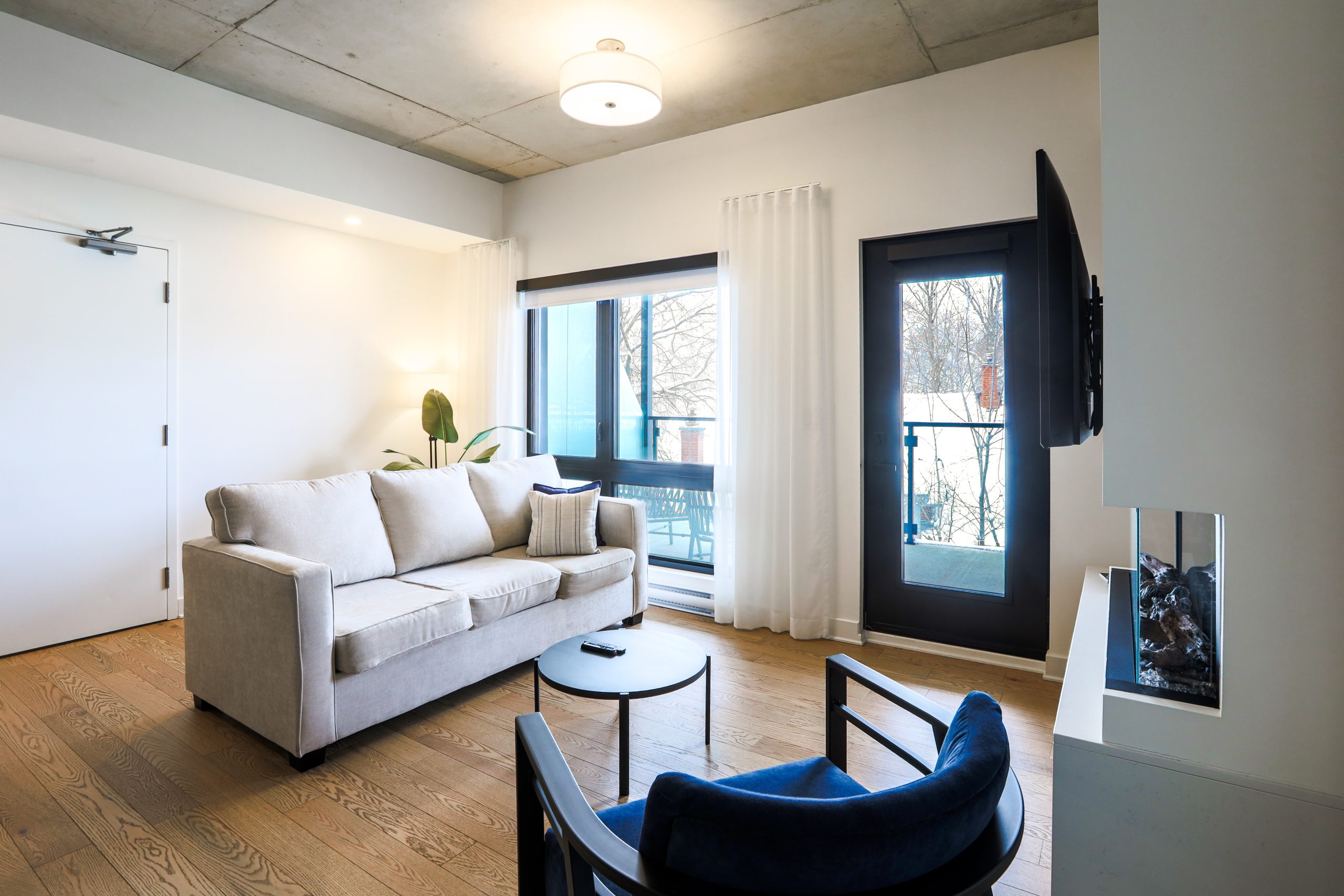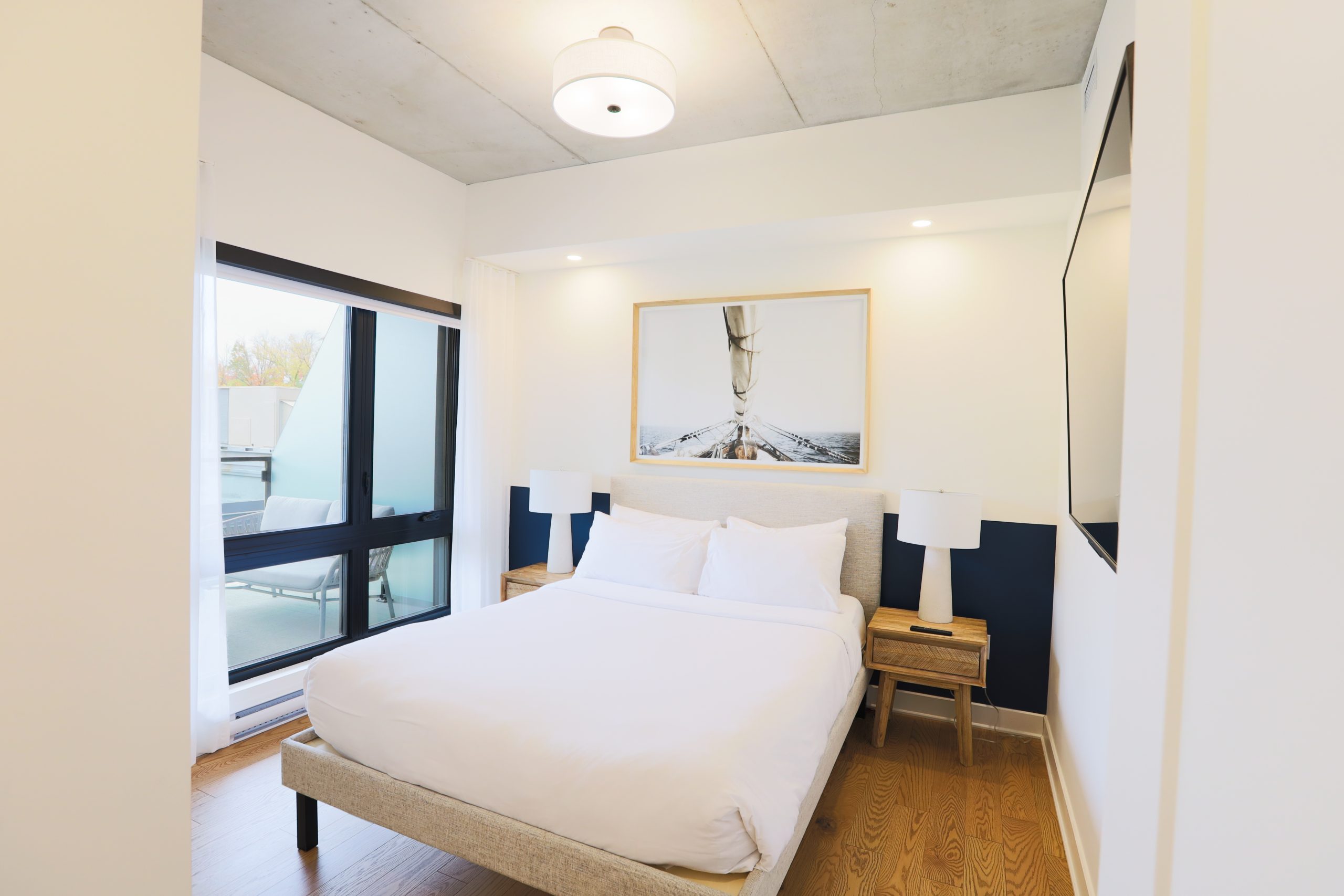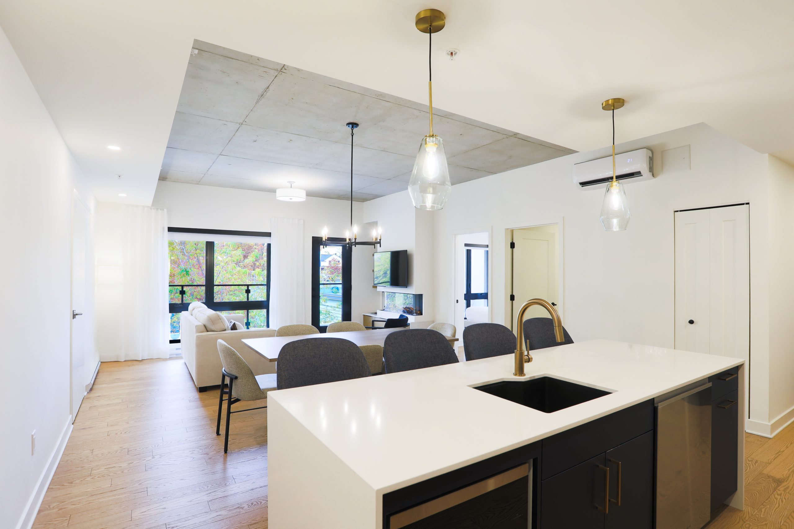 Une Suite élégante offrant une chambre fermée, une cuisine complète, une laveuse et sécheuse, un grand lit et un balcon privé.