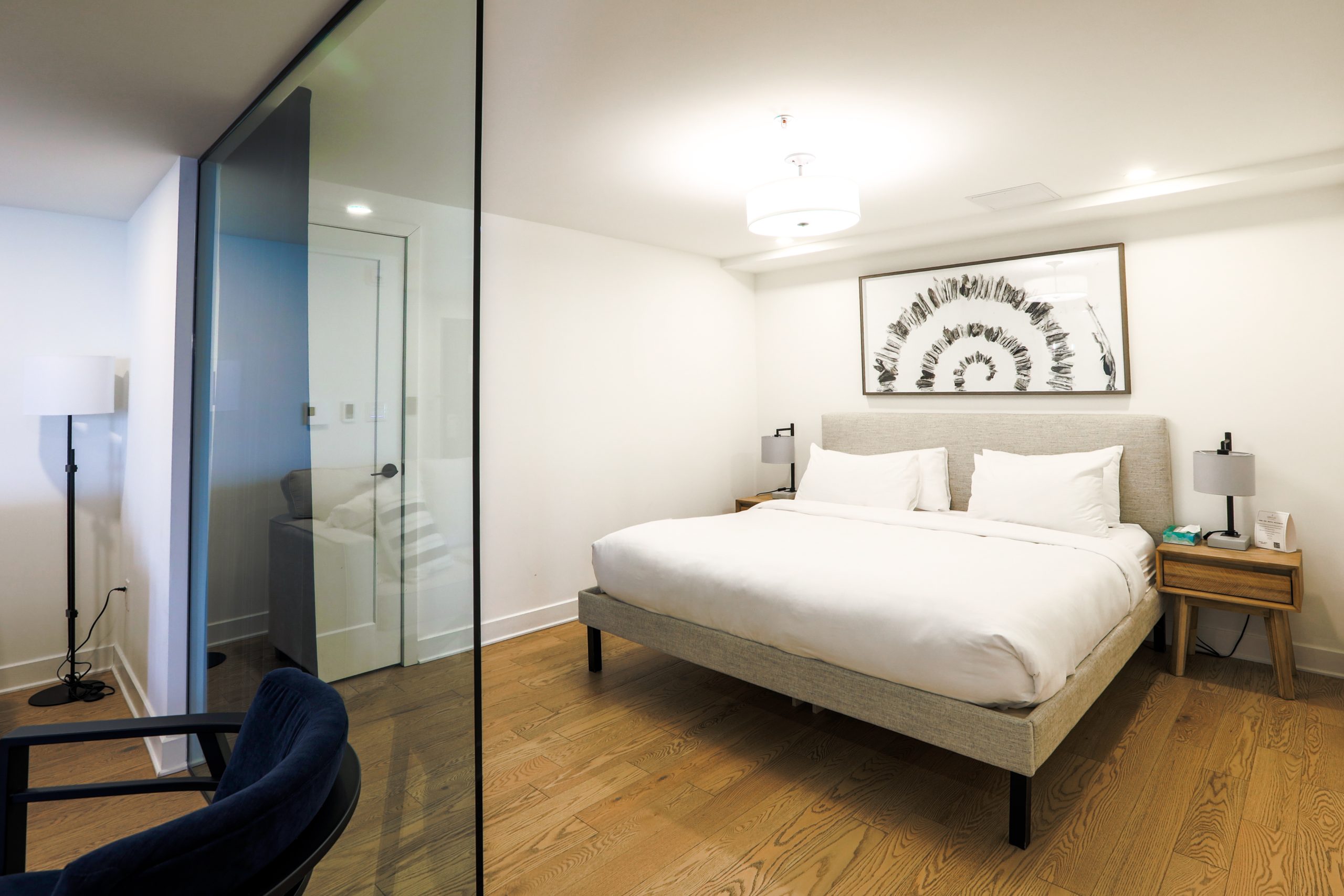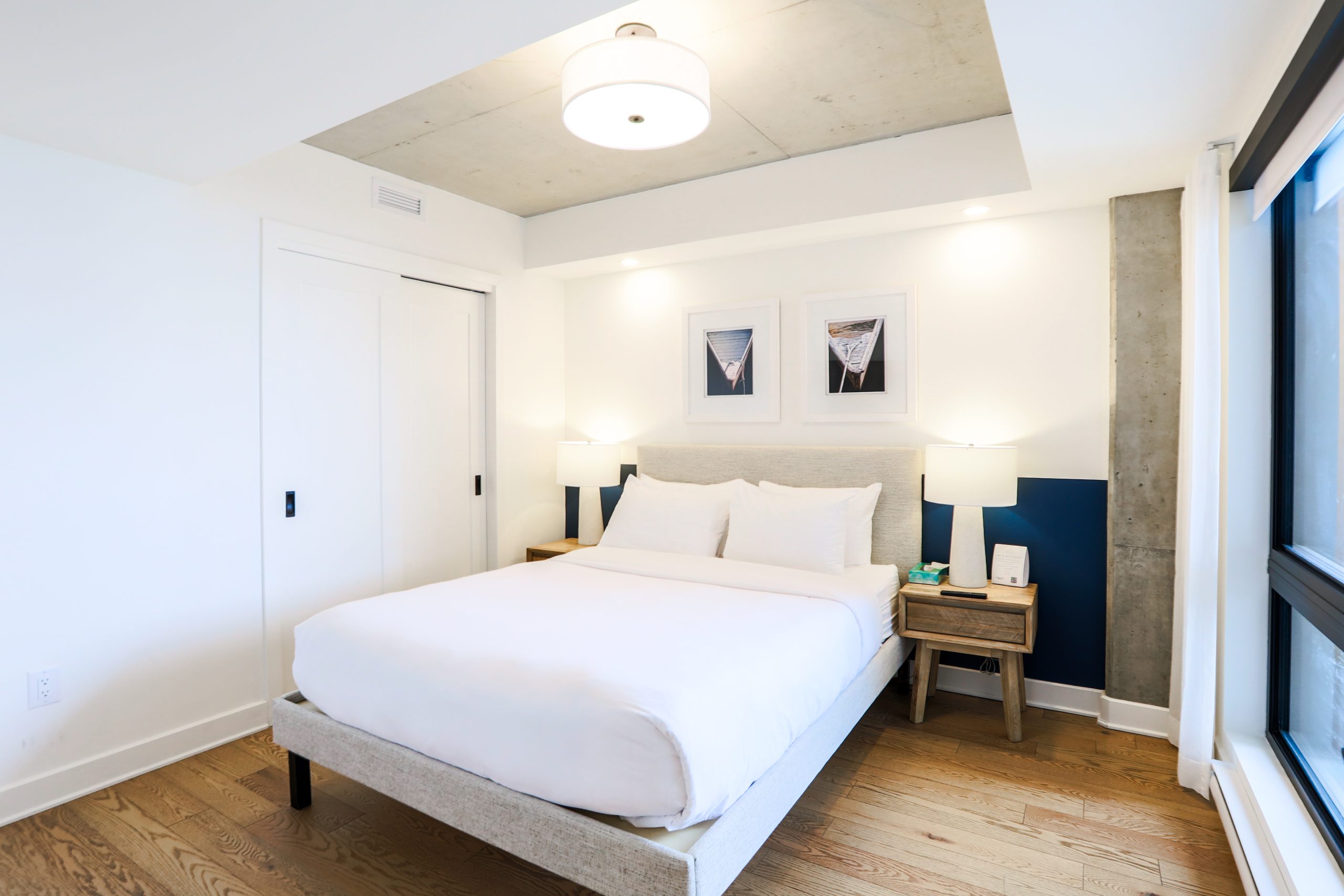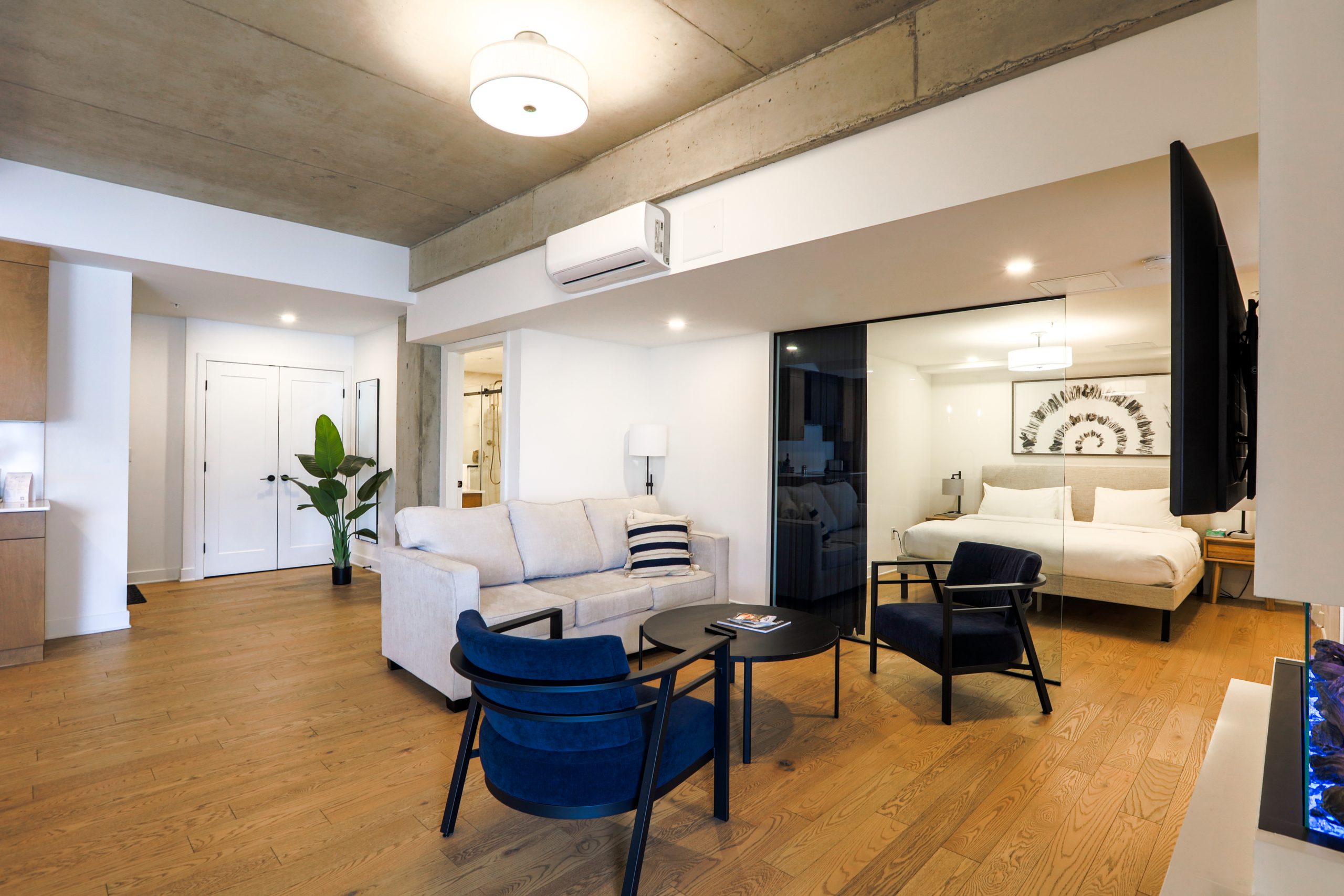 Une suite de deux chambres, dont une ouverte et une fermée, offrant un grand lit, un très grand lit et un balcon privé.