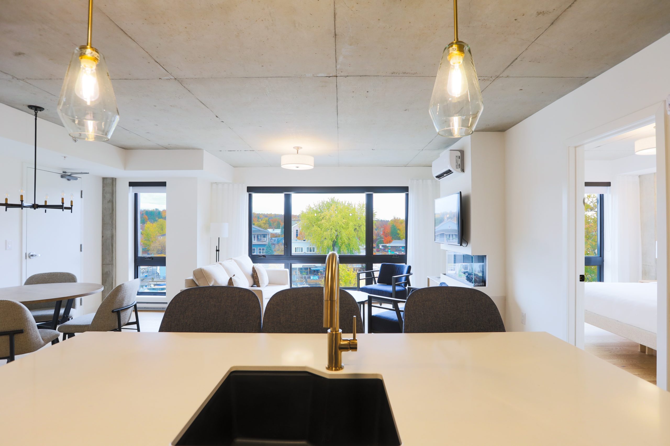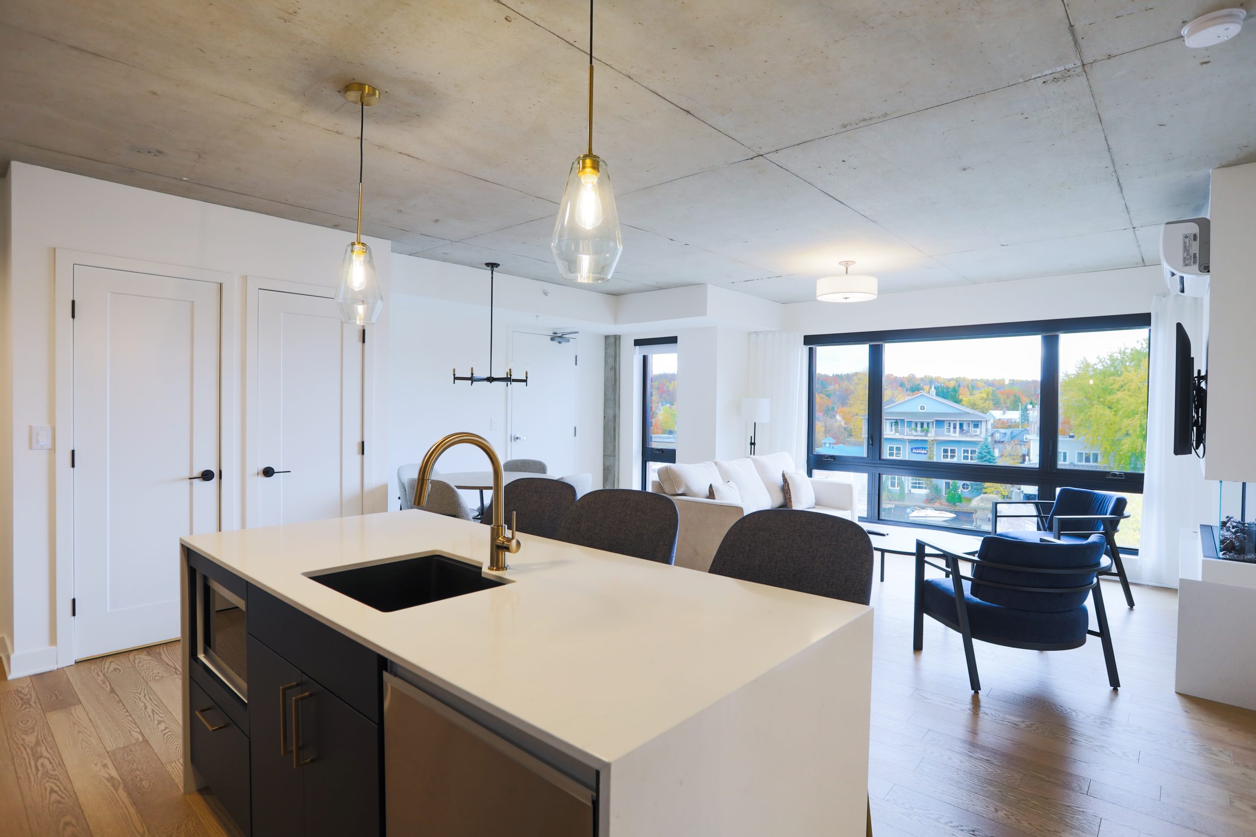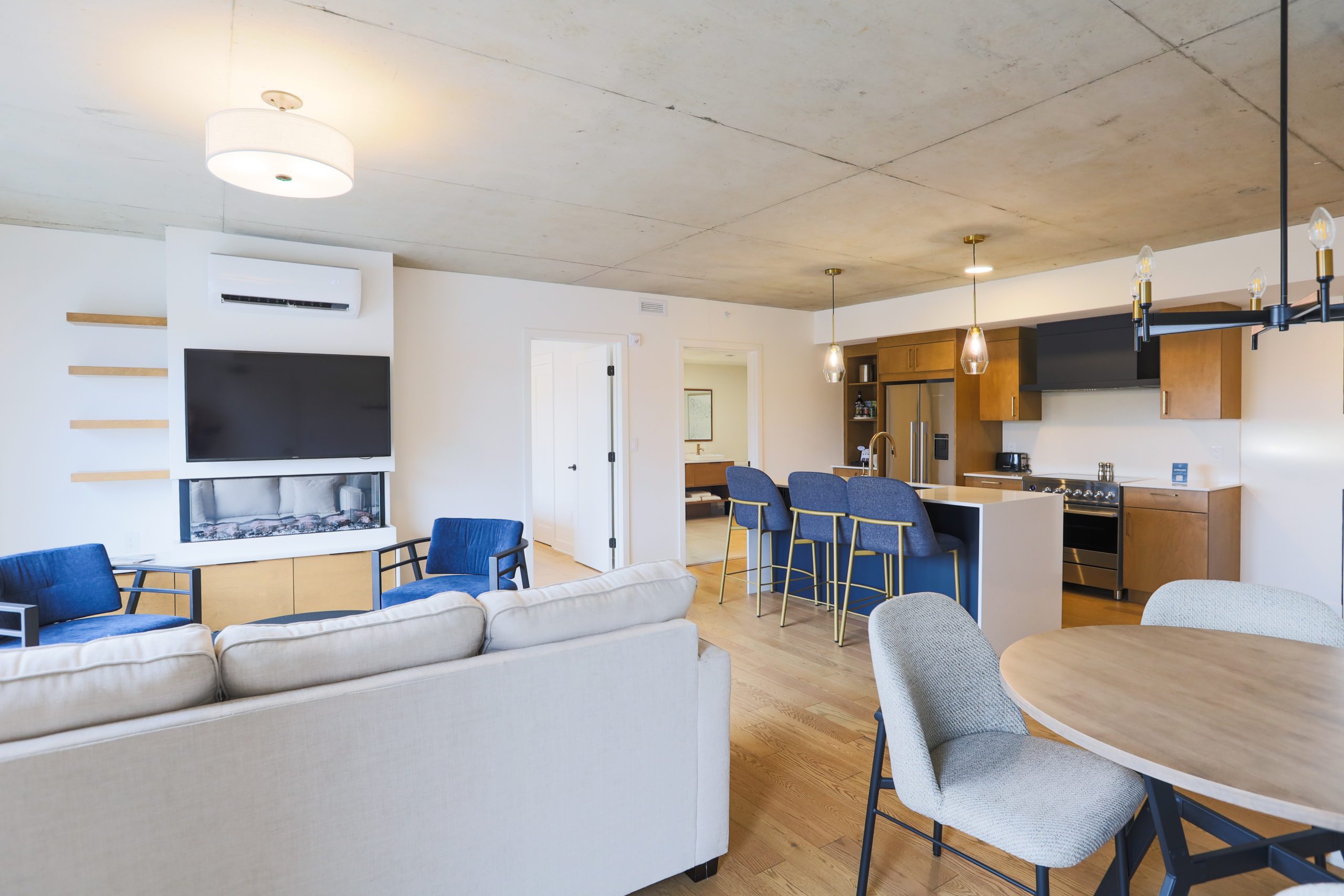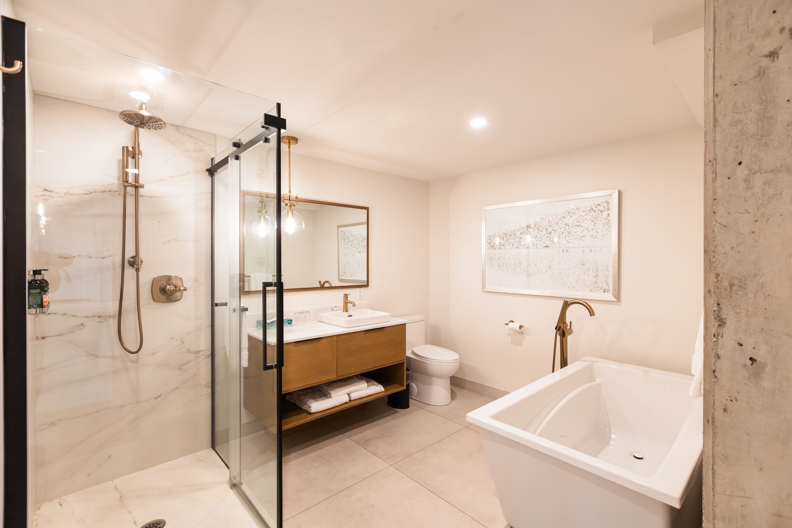 Une Suite d’une chambre offrant une cuisine complète, une salle de bain avec baignoire, une laveuse et sécheuse, ainsi qu’un très grand lit.