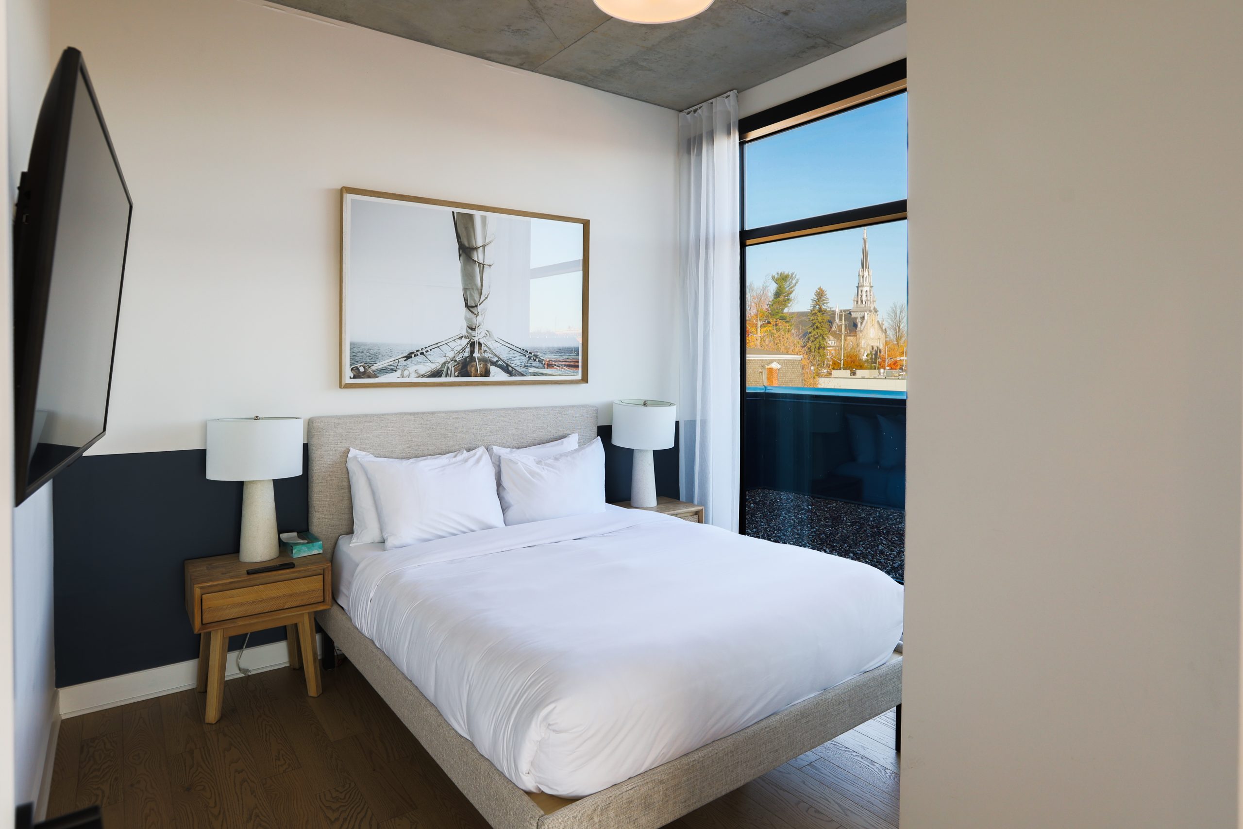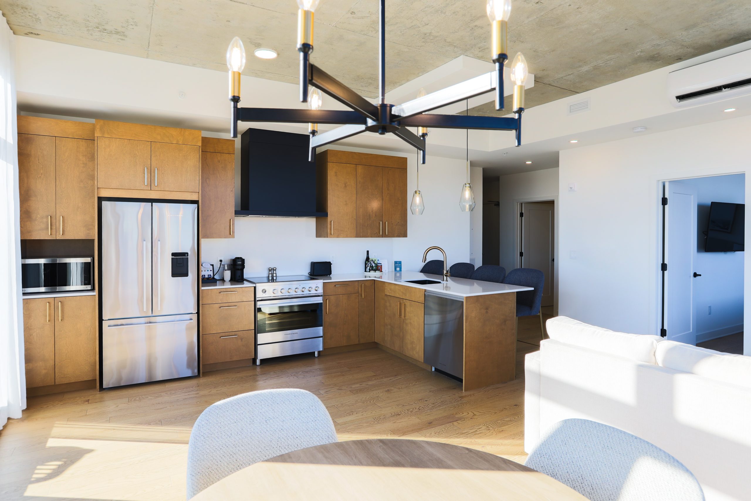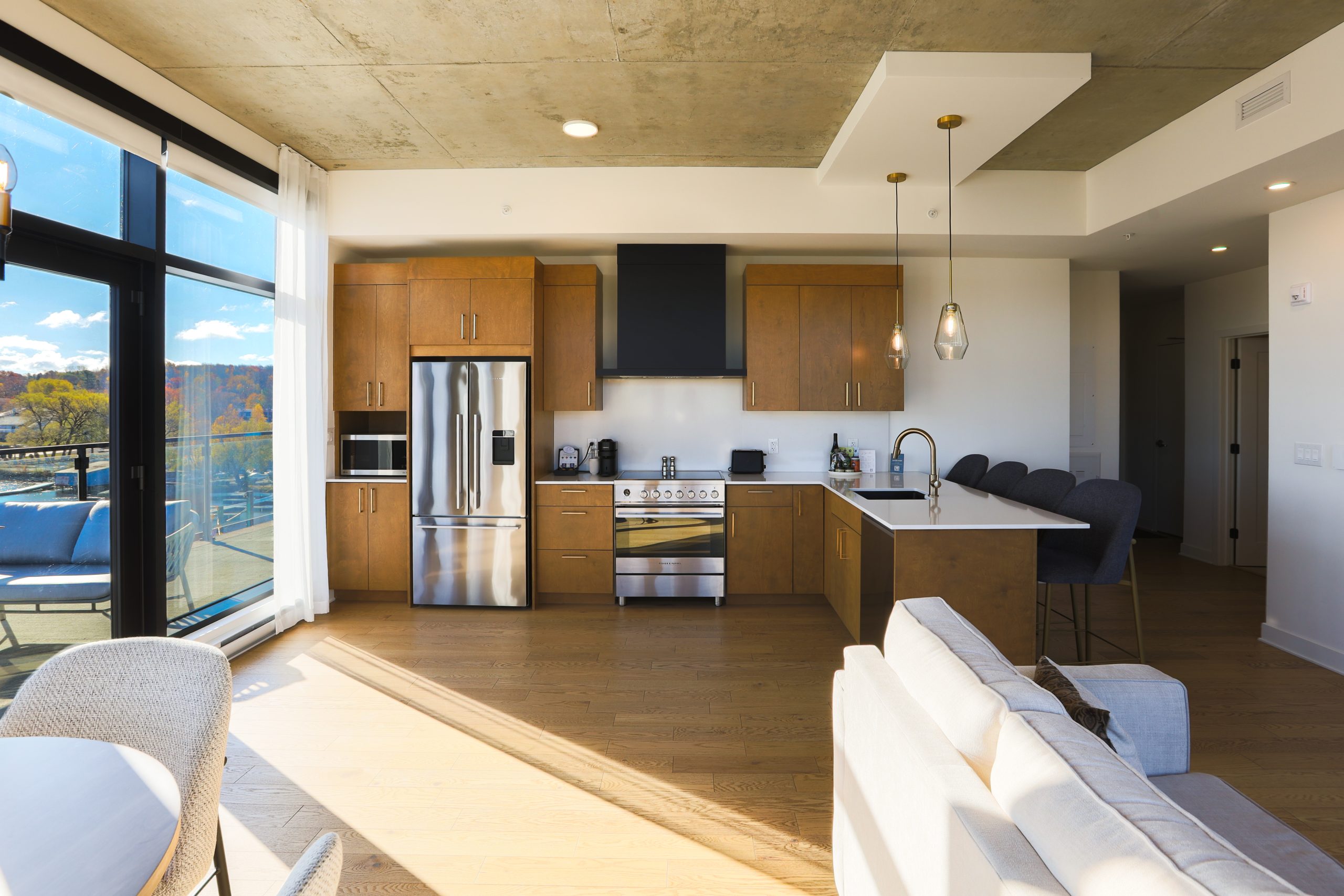 Une unité d’une chambre offrant une cuisine complète, une laveuse et sécheuse, un grand lit et un balcon privé.