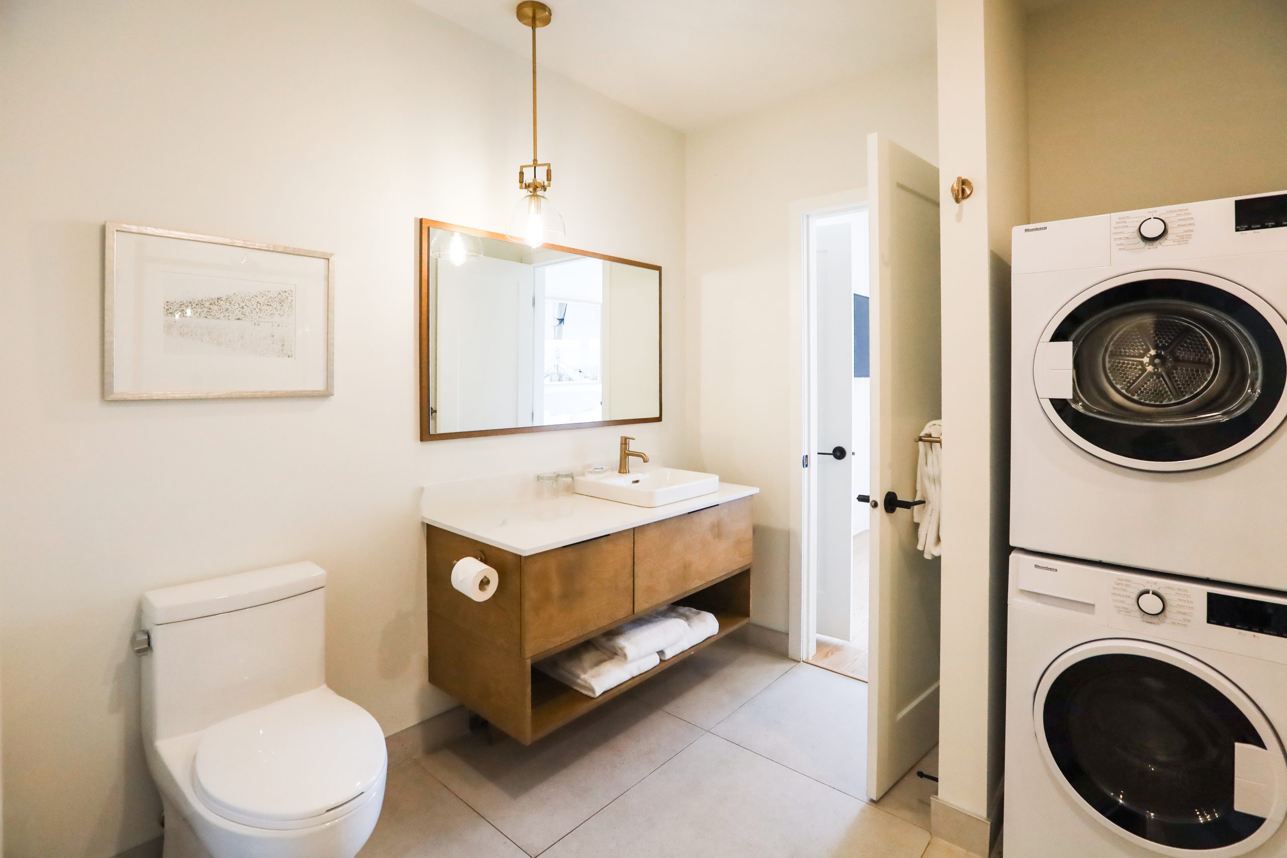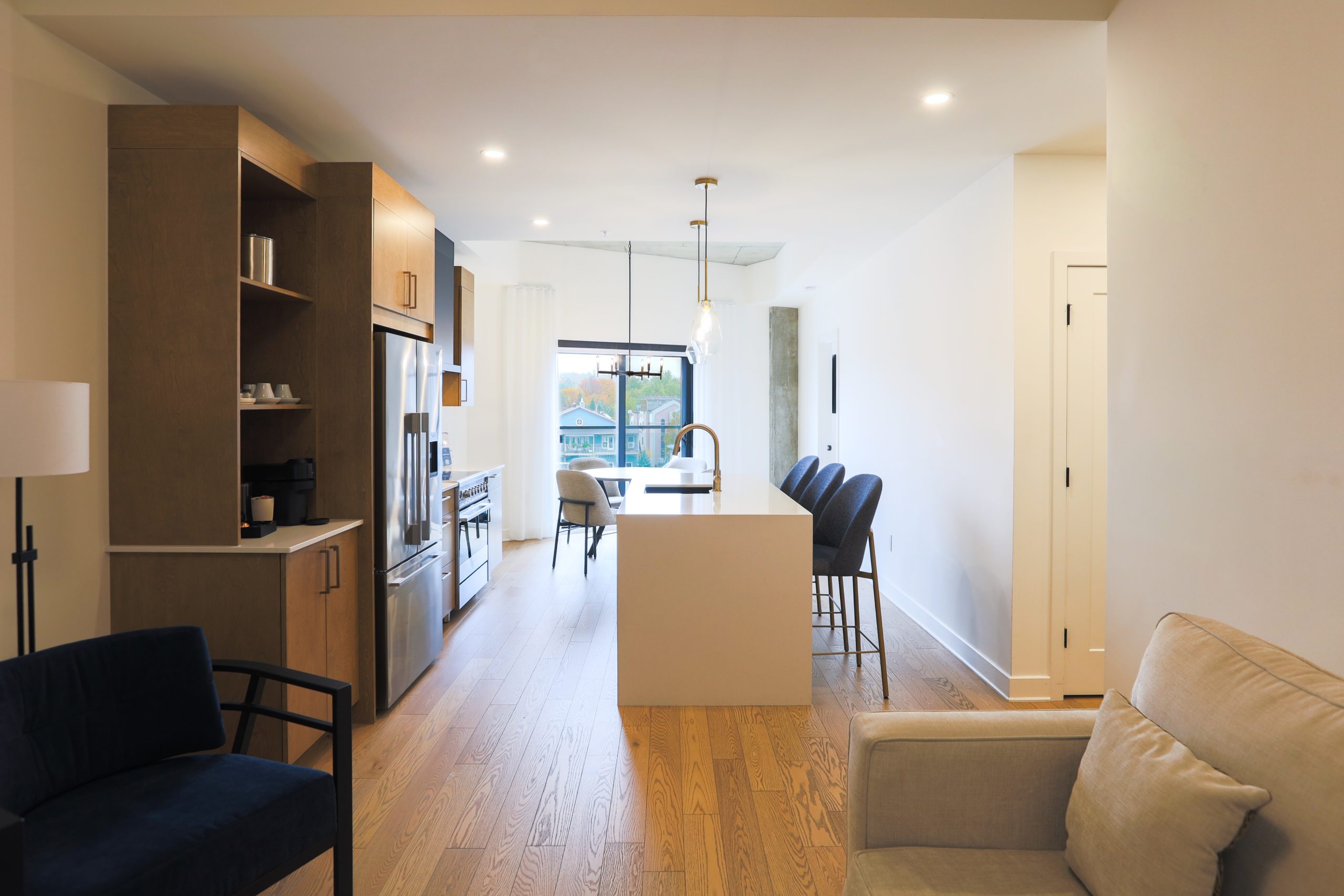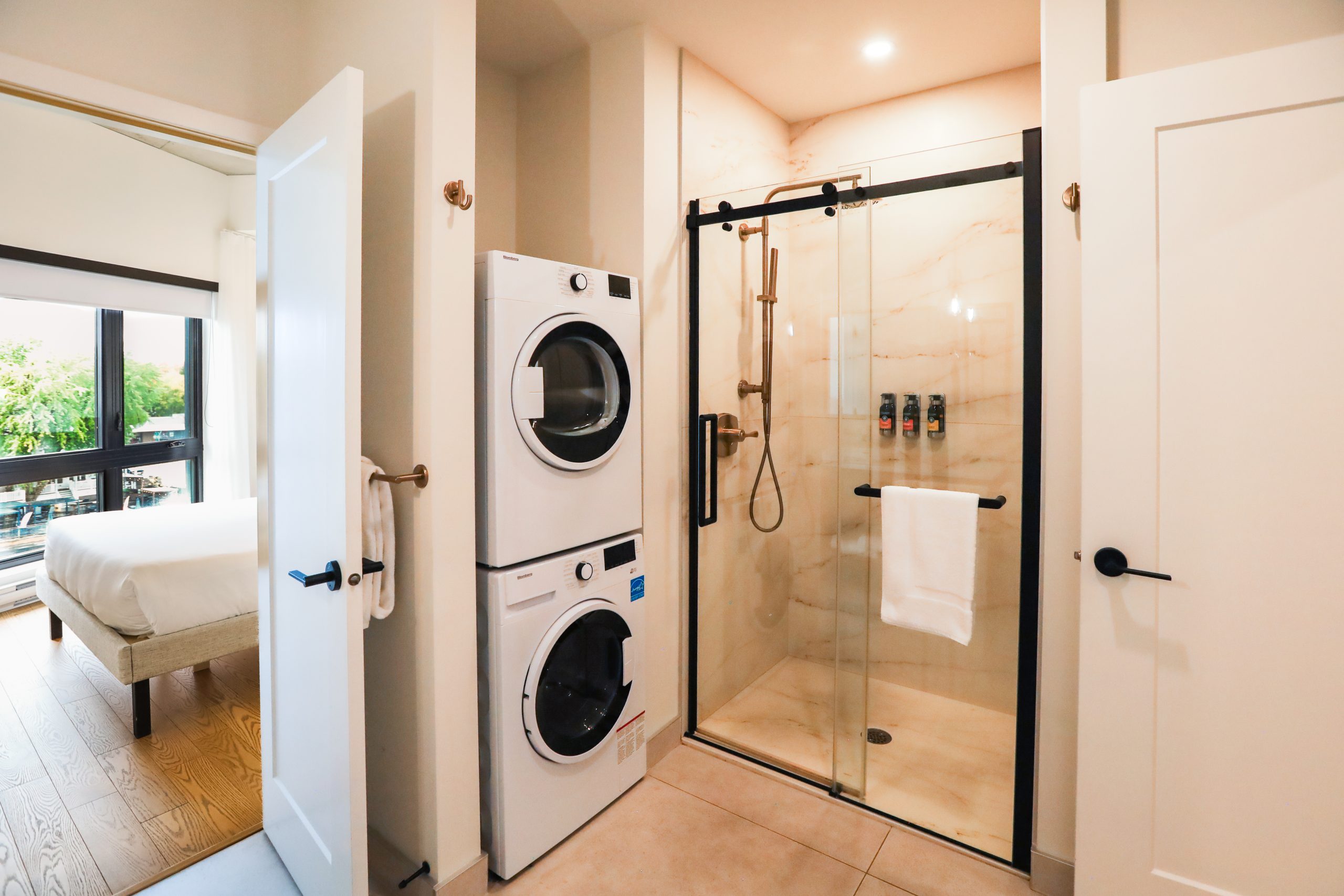 Une unité d’une chambre offrant une cuisine complète, une laveuse et sécheuse, un grand lit et un balcon privé.